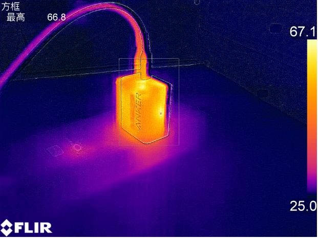 再来看另一侧,最高温度为66.8℃,温度大约上升了38.5℃ 。
