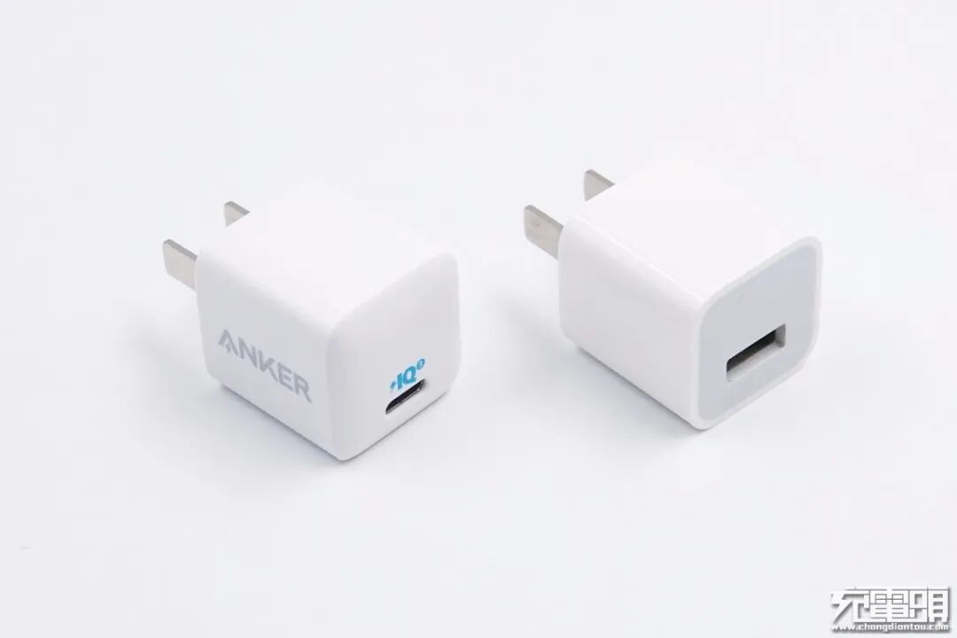 将充电器与苹果“五福一安”充电器放在一起,体积几乎一致,风格也有相似之处。可以套用前代的夸赞说:Anker安克Nano 20W PD充电器仅有五福一安的体积却身怀20W的性能。