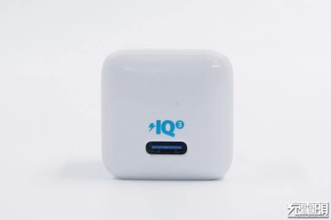 亮面的接口面板手感顺滑,与微磨砂的机身形成错落感,也能使用户迅速找到接口面板。充电器接口设置在靠下的位置,USB-C接口内使用蓝色胶舌。接口的上方丝印着IQ3字样,它是ANKER独家的“IQ 3.0” (全称PowerIQ 3.0)快充协议,兼容了PD、QC、Apple 2.4A等快充协议。