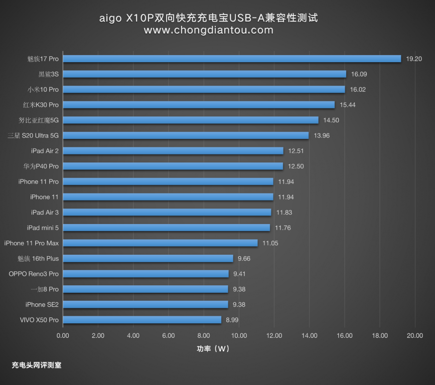 从柱状图上来看,魅族17 Pro的功率最高接近20W,其他握手快充手机的功率在15W左右,苹果设备的功率在12W左右。