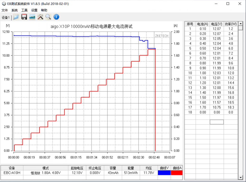 十、最大输出功率 使用EB程控电子负载测试aigo18W PD充电宝的最大输出功率,以0.1A为电流步进幅度,10秒为时间间隔,最终录得最大输出为11.57V 1.60A 18.5W,额外的功率余量为2.7% 。