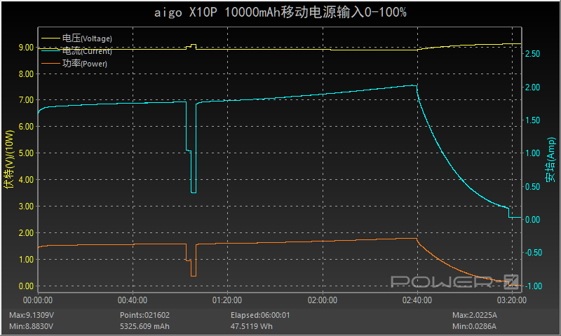 六、输入测试对充电宝的输入全程进行测试,测试开始时便握手9V 2A输入档位,整体输入的过程较为平缓,只是在中间出现了一下波动,约2小时40分后,功率和电流逐渐下降直至充电结束,全程耗时约3小时18分,最大功率为8.88V 2.01A 17.92W。