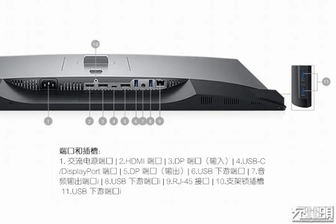 U2721DE接口面板带有一个HDMI接口、一个DP输入接口、一个USB-C接口、一个DP输出接口、4个USB-A接口,一个3.5mm音频输出口,一个RJ45网络接口。其中USB-C可提供最高90W PD快充输出功能,4个USB-A的其中两个放置在侧面方便使用。价格方面,U2721DE定价为3499元。