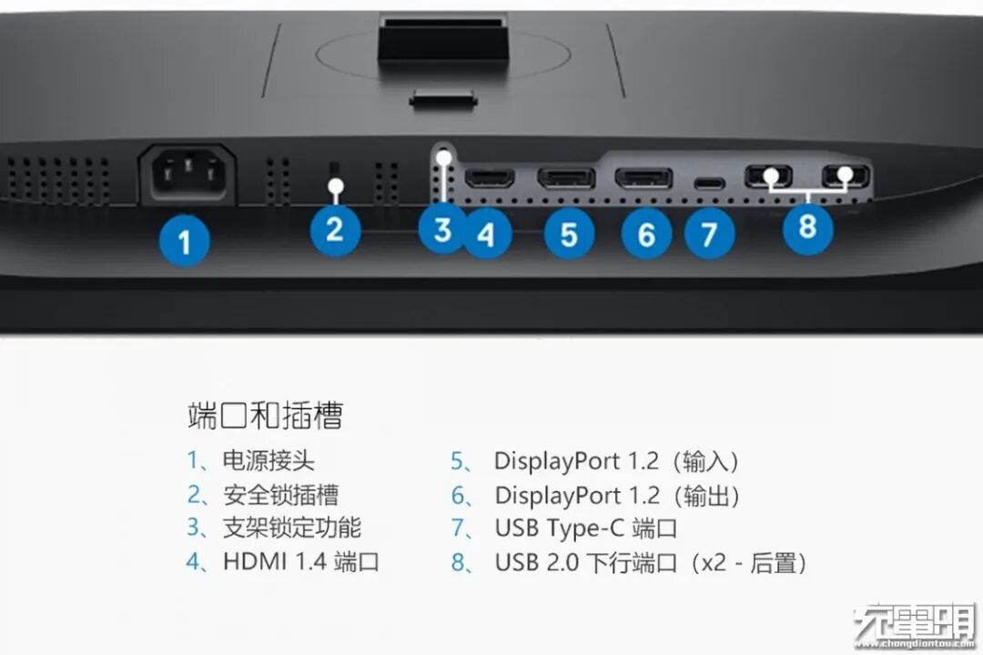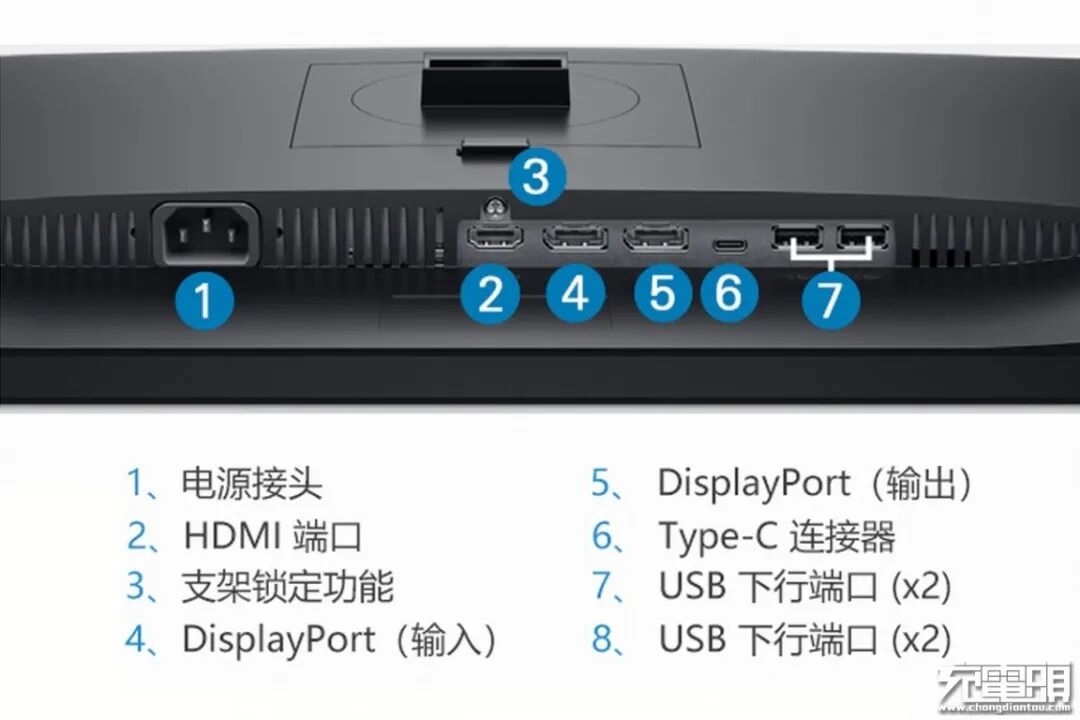 U2719DC接口配置如下,拥有一个HDMI接口、一个DP输入接口、一个USB-C全功能接口、一个DP输出接口,一个3.5音频接口,4个USB-A接口。其中USB-C最大可支持65W PD充电输出,4个USB-A中的两个放置在侧面方便使用。