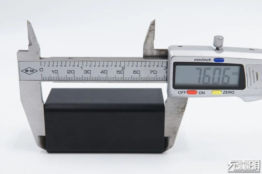 使用游标卡尺实测充电器长76.06mm。
