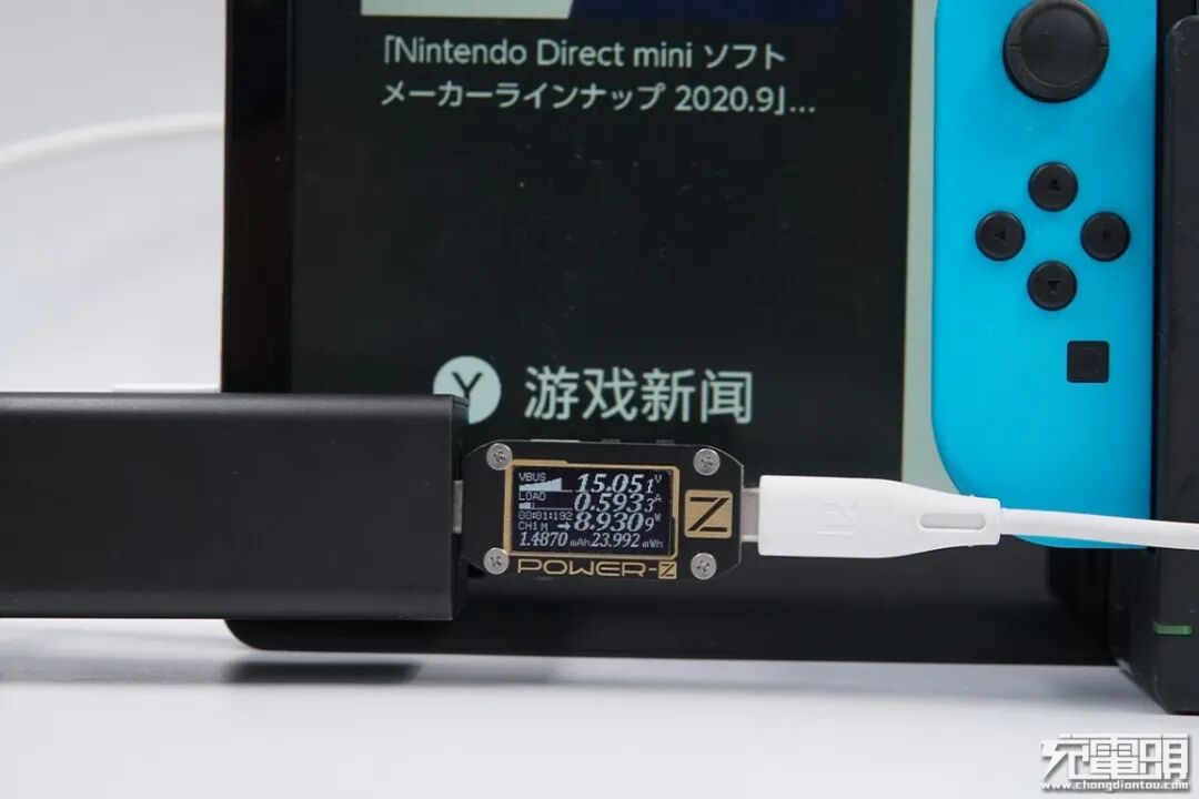 Switch底座支持USB PD快速充电协议,使用USB-C对Switch底座充电,功率为15.05V 0.59A 8.93W,可以开启底座模式,因为屏幕处于亮屏状态,功率低属于正常现象。