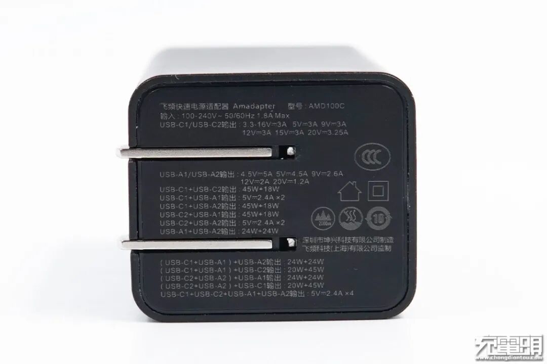飞频四口PD快充整体为黑色,有黑白两色可选,除了侧面“Amadapter 65W”之外,初看没有多余的点缀,十分简洁,一体感很强。