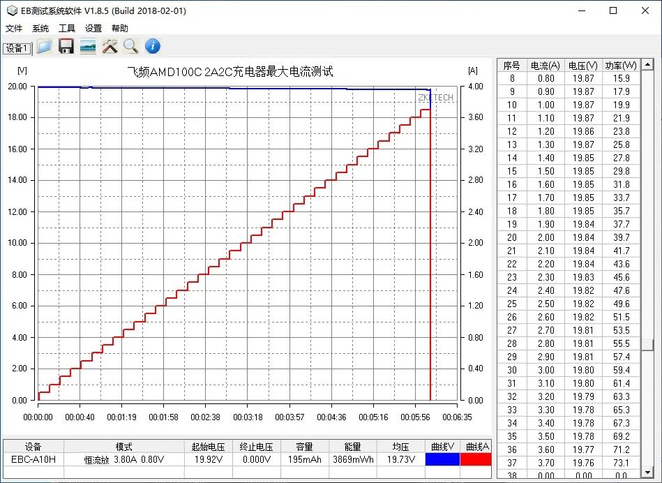 使用EB程控电子负载测试飞频四口PD快充充电器USB-C接口的最大输出功率,以0.1A为电流步进幅度,10秒为时间间隔,最终录得最大输出为19.76V 3.70A 73.1W。