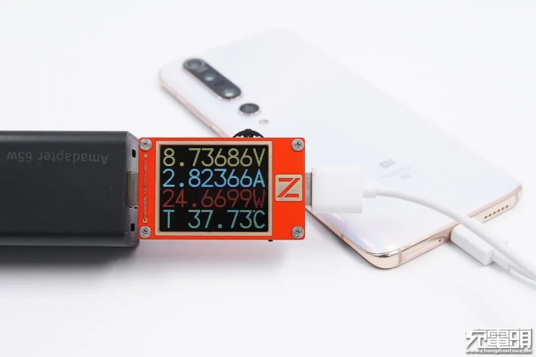 小米 10 Pro手机支持PPS、QC和USB PD快速充电协议,使用USB-A对小米 10 Pro手机充电,功率为8.73V 2.82A 24.66W。