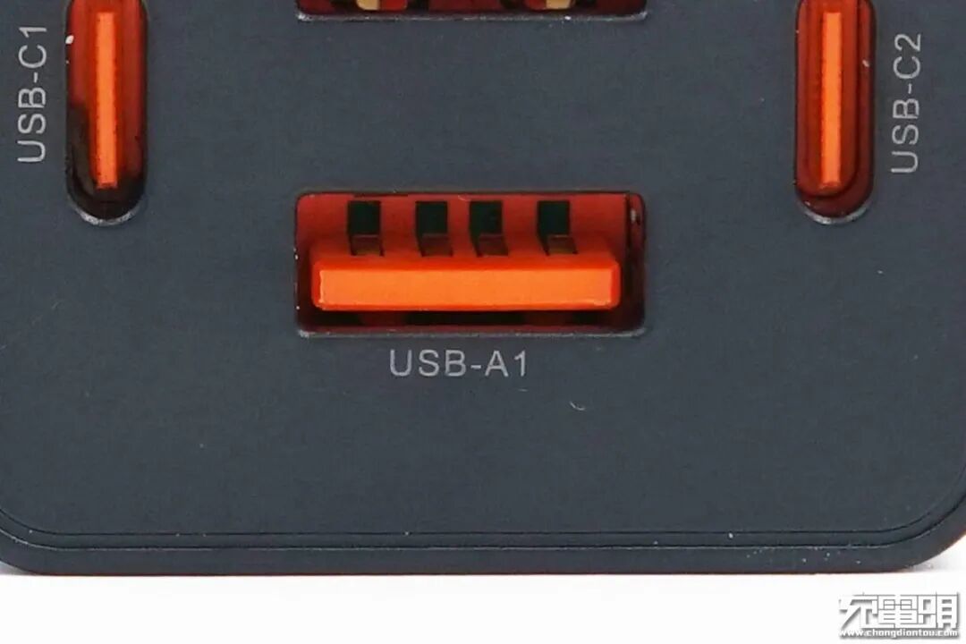 微距镜头拍摄USB-A输出口母座可以看到,最边上的两个电流弹片没有进行加粗处理,前端也没有特殊触点,橘黄色代表的特殊协议到文章下半部分的测试环境观看。