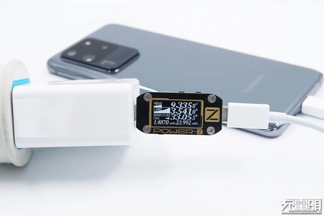 三星 S20 Ultra 5G手机支持PPS、AFC和USB PD快速充电协议,使用USB-C对三星 S20 Ultra 5G手机充电,功率为9.33V 3.54A 33.05W。