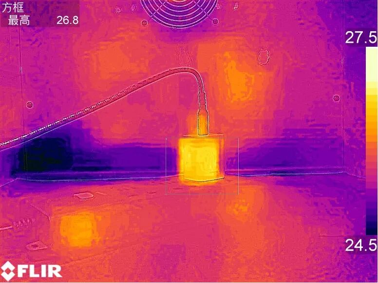 对充电器的温升进行测试,测试条件为在温度约为25℃的恒温箱内以20V 1A 20W的功率持续输出一小时进行测试。准备开始测试前,最高温度为26.8℃。