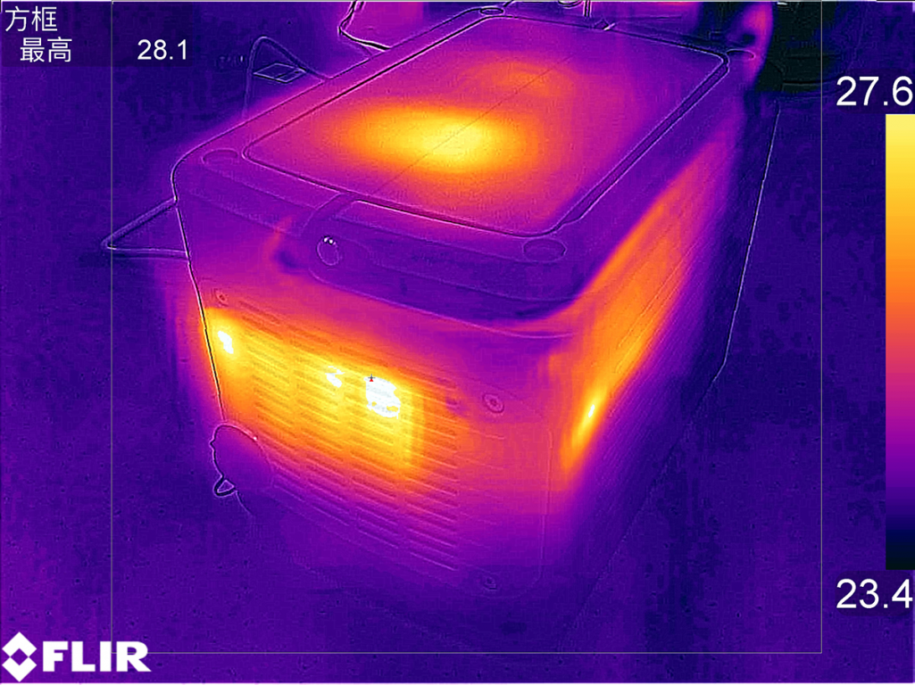 在经历了半小时的持续输出之后,使用热成像仪拍摄电源的温度,当前最高温度为33.6℃,温升5.5℃。