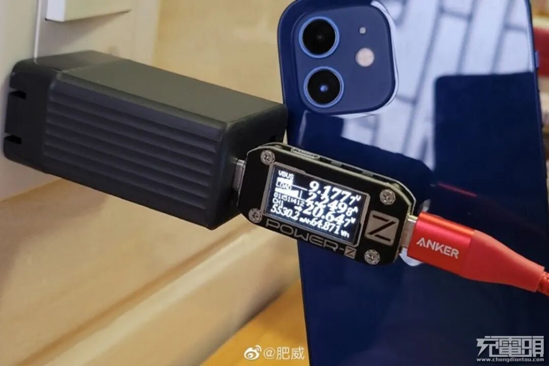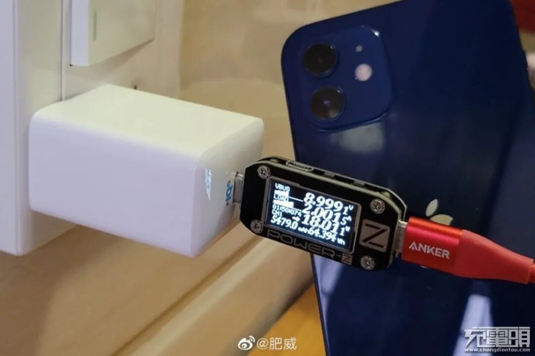 使用Anker安克 65W Pod Lite充电器给iPhone 12充电,电压8.99V电流2.00A,功率18.01W。通过以上3款适配器给iPhone 12充电,可以看到都可以开启9V电压档位的PD快充,功率在19W左右,属于正常表现。图片来自知名微博数码博主肥威。