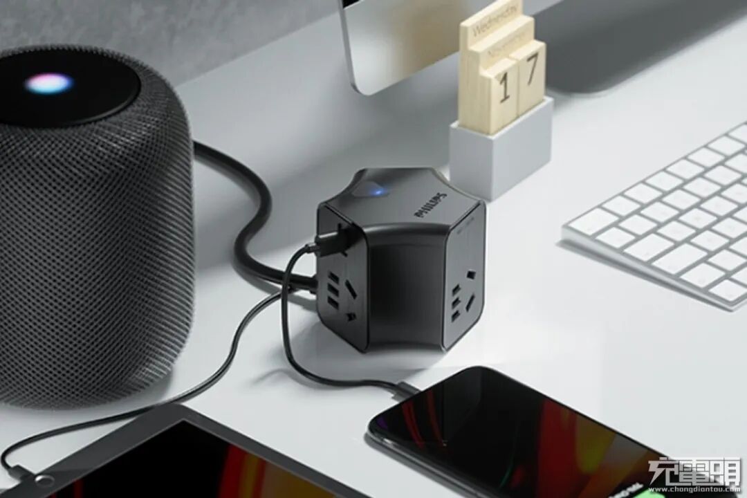飞利浦SPS2213G/93外观十分特别,就像半个魔方的尺寸,占据更小空间可以放在显示器下面使用,同样保持着插线板功能+PD快充模块的搭配。