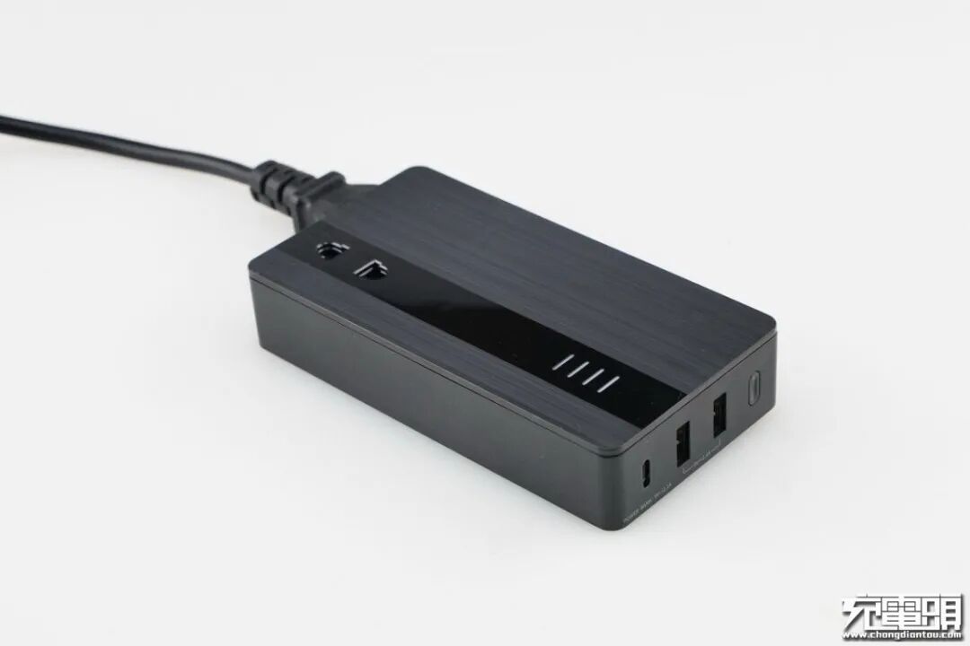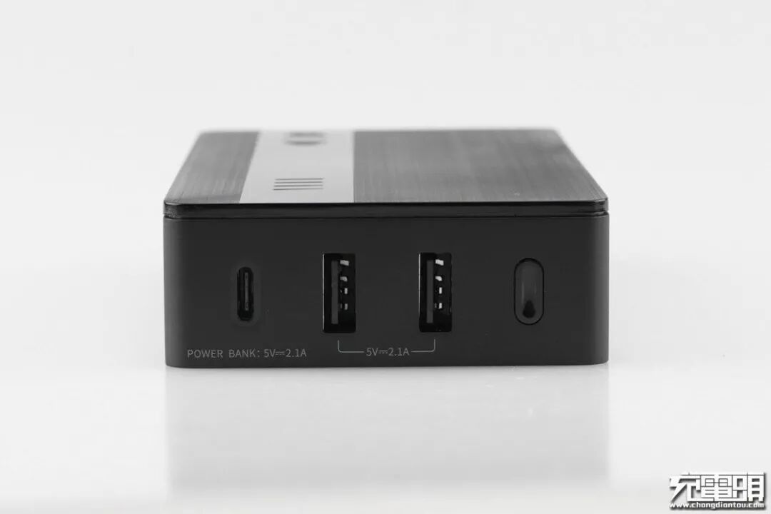 PD快充输出。两个USB-A输出口,单一USB-A输出时可提供18W快充输出,双USB-A口输出时锁定5V3A输出模式,一个USB-C输出口,单独使用时最高输出65W