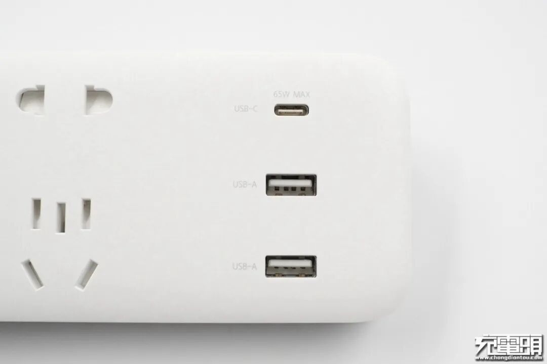 插线板USB模块共三个输出口,分别是一个65W USB-C PD快充接口,两个18W USB-A