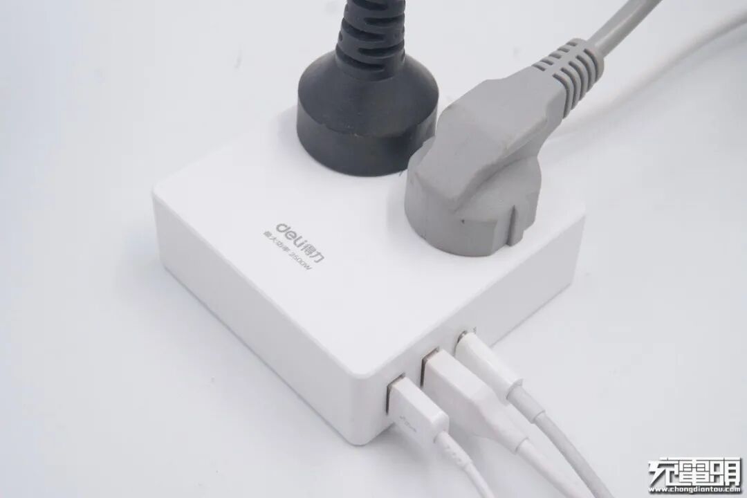 得力45W PD插线板拥有两个AC插孔,孔距为42mm大孔距,方便设备使用,插满两个AC插头,未有打架情况。三个USB接口插满了为三台数码设备进行供电,相比起传统插线板插了好几个充电器的情况,得力PD插线板明显整洁多了。