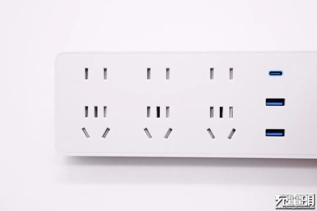 紫米PD插线板全白色性冷淡设计风布局十分工整,主要分为AC插孔区域与USB输出区域,插线板配置了六个新国标交流插孔,分别是三个2孔插孔、三个2+3插孔。插线板三围尺寸为:225mm x 71mm x 28mm,线材长度180cm。
