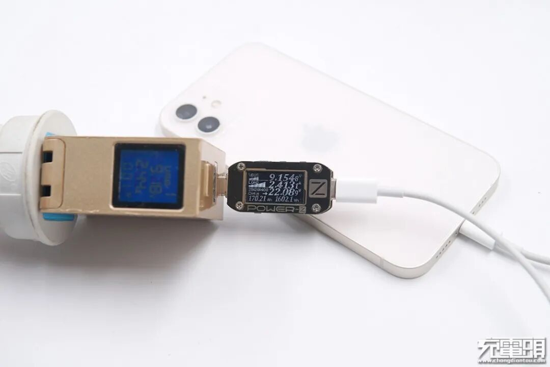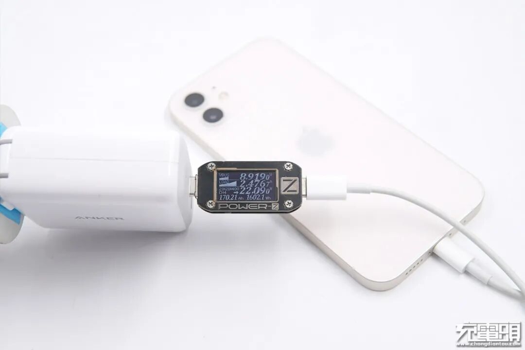 使用Anker安克45W PD A2322充电器为iPhone 12充电,电压8.9199V,电流2.47A,功率22.09W。