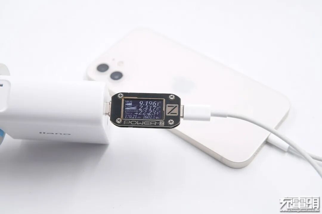 使用llano绿巨能45W PD TC-019充电器为iPhone 12充电,电压9.19V,电流2.41A,功率22.23W。
