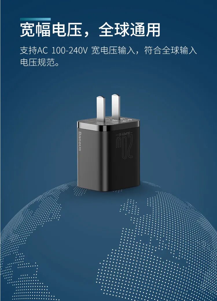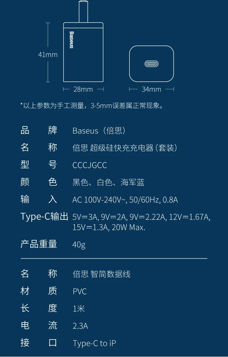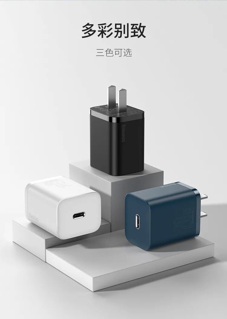 倍思20W超级硅充电器有黑色、白色、海军蓝三种颜色款式可选,对应苹果iPhone 12黑白经典款颜色以及新增的海军蓝配色款式。侧面印有四大卖点,分别是“20W PD快充”、“多协议兼容”、“智能识别芯片”、“自动负载检测”。产品尺寸:41*34*28mm,产品重量:40g。