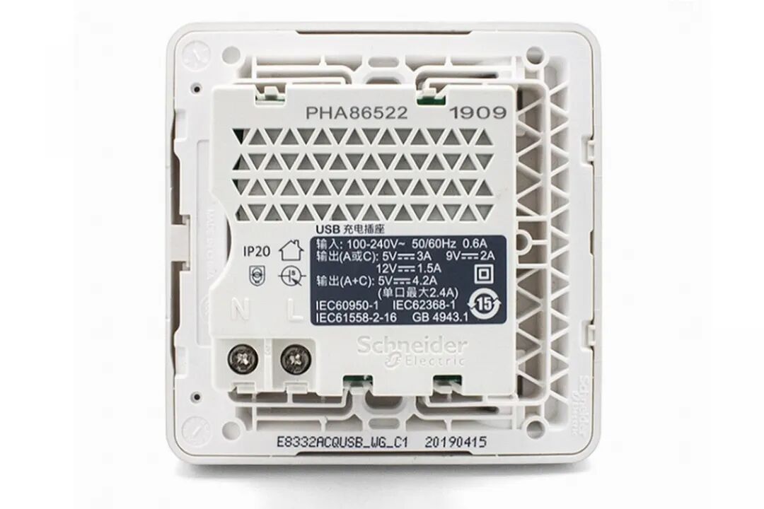 施耐德PD快充面板底部满布了三角形加强筋,同时直流模块附近大范围采用了三角形开孔设计以帮助散热保证长时间使用稳定性,供电采用螺丝接线柱方式装配。参数方面,输入支持100-240V