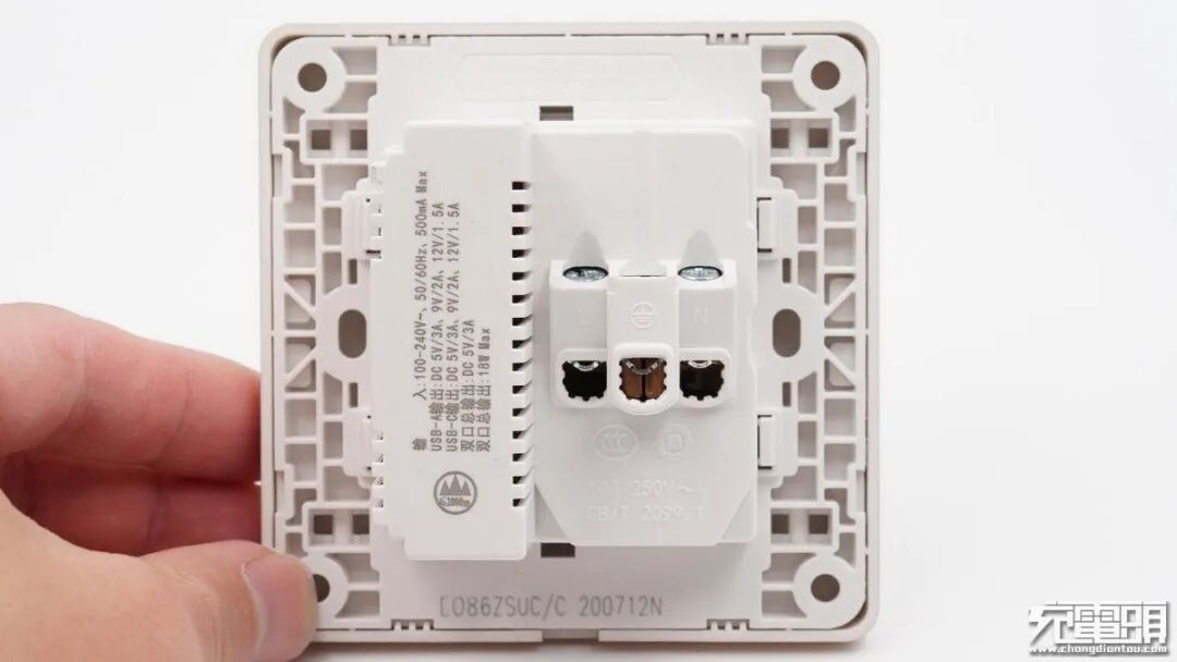 插座背面设有导线接线槽,并标注USB口参数信息,开关电源模块两侧有散热口,面板底座采用了网格状设计加强抗压性,长久使用也不易变形,拉扣式接线设计方便安装不伤线材。支持单口快充双口5V输出,下方是序列号和生产日期,20年7月生产。