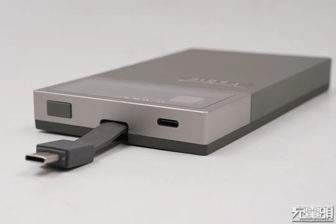自带线日常不用时收纳在顶端的凹槽中,整个移动电源唯一的一个接口也隐藏在这里,USB-C接口支持18W输入。