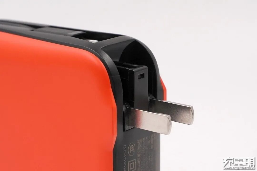 双模充顶部带有一个220V折叠插脚,使用时取出,不用的时候可以放回不影响整体性。在插座上通电使用的话可以变成充电器模式,输出功率高达65W,外出携带使用内置20000mAh电芯输出,最大输出功率30W。
