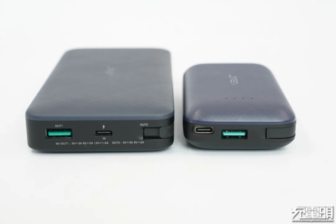 接口配置相同,均为USB-C双向快充接口以及USB-A输出接口,只不过10000mAh版本由于外形体积的限制导致USB-C接口有些挤。