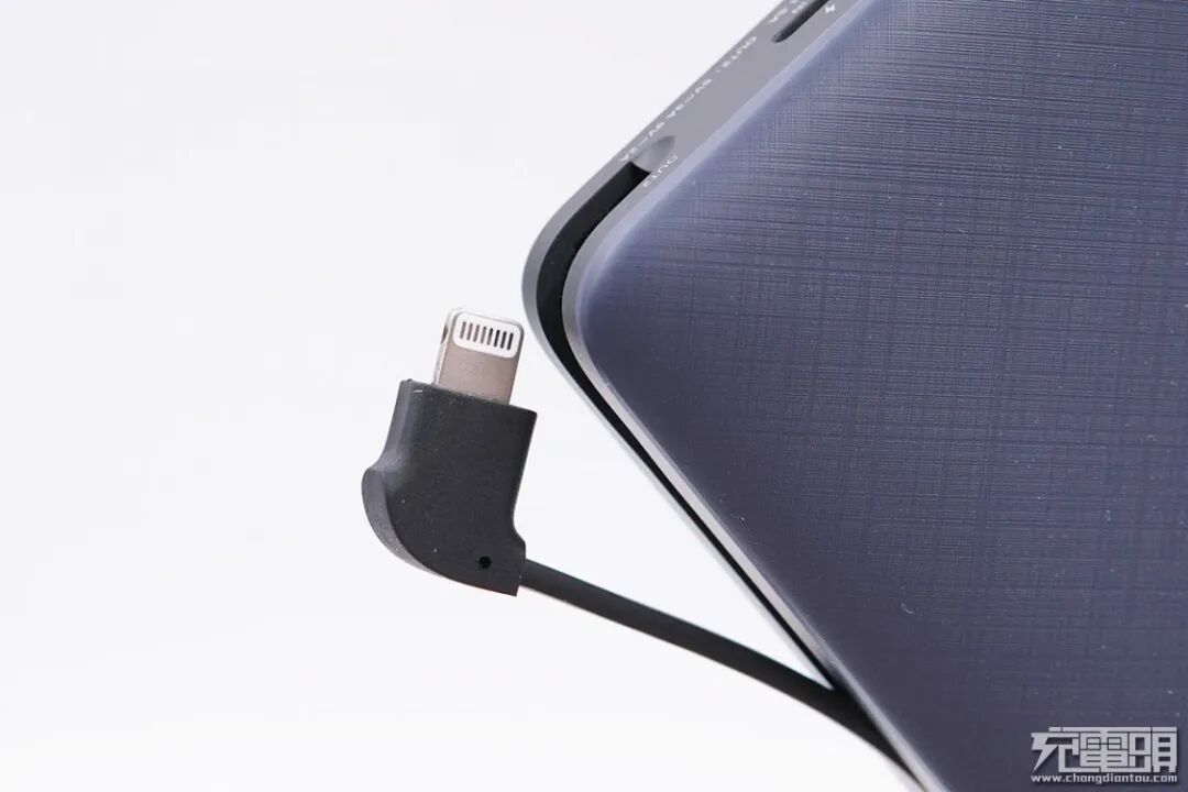 这款移动电源最大的特色就在于自带充电线,移动电源外壳部分带有凹槽设计,不使用的时候将线材直接放回凹槽里面,也不影响移动电源的整体性。两款移动电源均采用侧面自带的隐藏式Lightning线的设计,都通过了苹果官方MFi认证,可以在不借助其他数据线的情况下为iPhone提供极速快充。