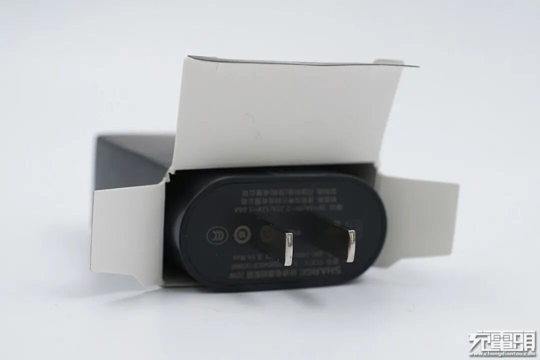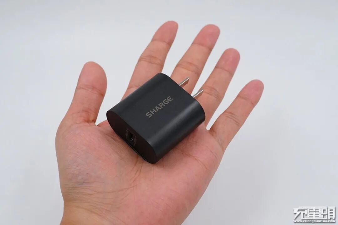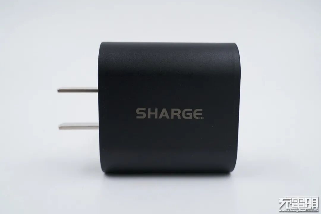 SHARGE闪极20W PD充电器的外观并未采用闪极特有的棱角硬朗ID风格,而是改为了圆边直面板设计,黑色表面哑光处理,两脚固定插脚。