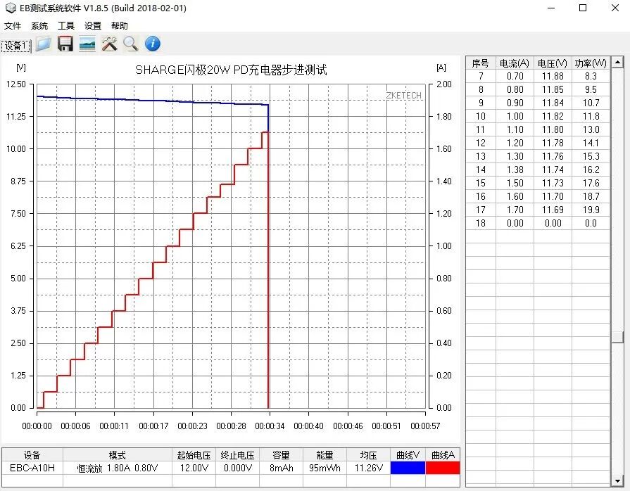 使用EB程控电子负载测试SHARGE 20W PD充电器12V档位的最大输出功率,以0.1A为电流步进幅度,10秒为时间间隔,最终录得最大输出为11.69V 1.70A 19.9W。
