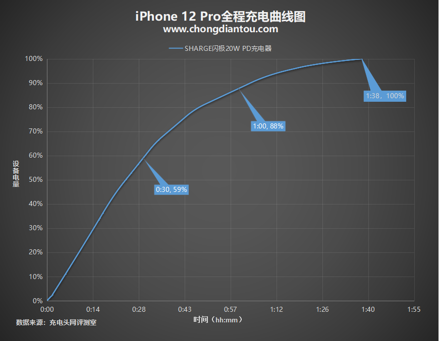 充电测试数据制作成表格,SHARGE 20W PD充电器半小时为iPhone 12 Pro充入59%电量;1小时充入88%电量;全程耗时约1小时38分。