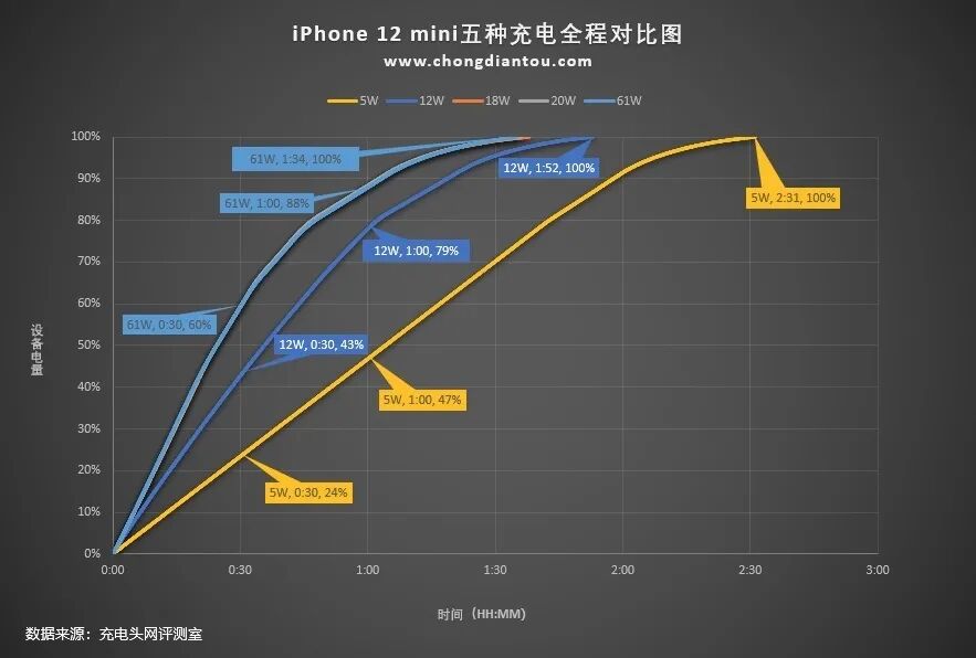 之前iPhone 8小屏机型由于电池小的关系,不管使用什么功率的PD充电器,PD快充功率都被限制在12W,速度与5V2.4A 12W充电器完全一致,被誉为“虚假的PD快充”。iPhone 12 mini身上这种情况终于改变,可以看到12W充电器与PD充电器速度被拉开,12W半小时充入43%百分比,速度可以接受但仍有未喂饱,5W则还是慢,太慢了。