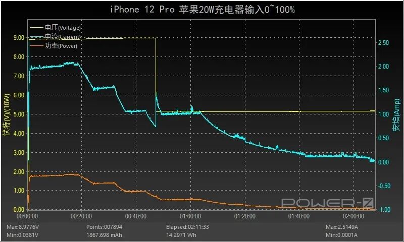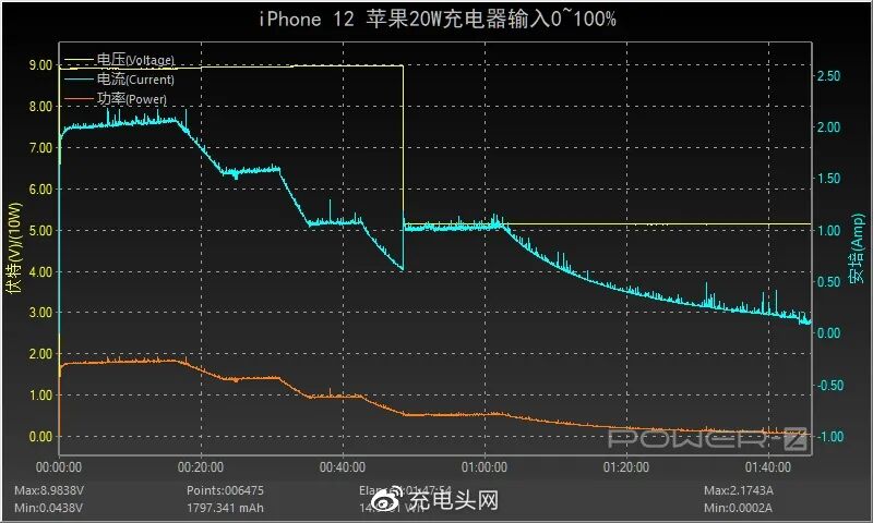 0%-100%全程充电充电方面,苹果20W充电器为iPhone 12充电,约16分前三大数据平台相对稳定,随后电流和功率呈阶梯式的下降状态,48分时电压降至5V输入,持续了约14分后功率和电流逐渐下降直至充电结束,全程耗时约1小时41分,功率最高为8.90V 2.06A 18.41W,功率平台在18W左右。