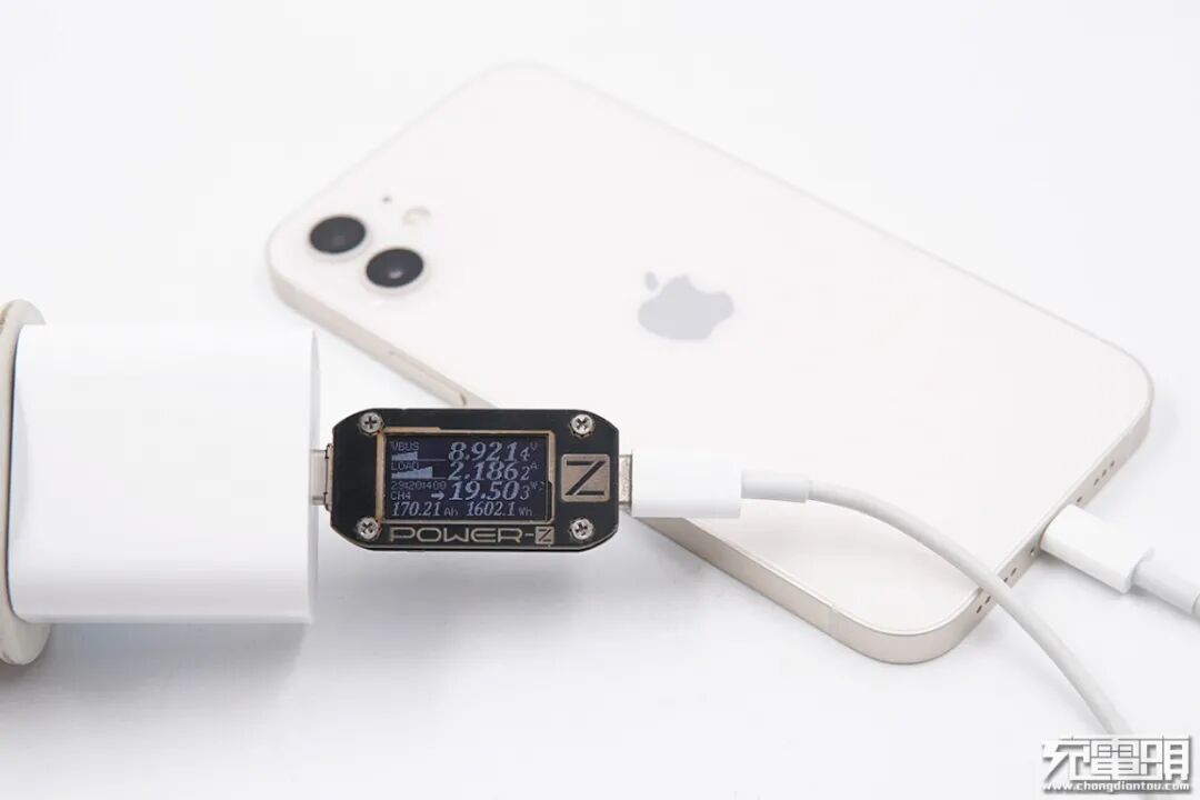 使用苹果20W充电器为iPhone 12 mini充电,录得瞬时功率为8.89V 2.15A 19.16W,功率已经接近20W。