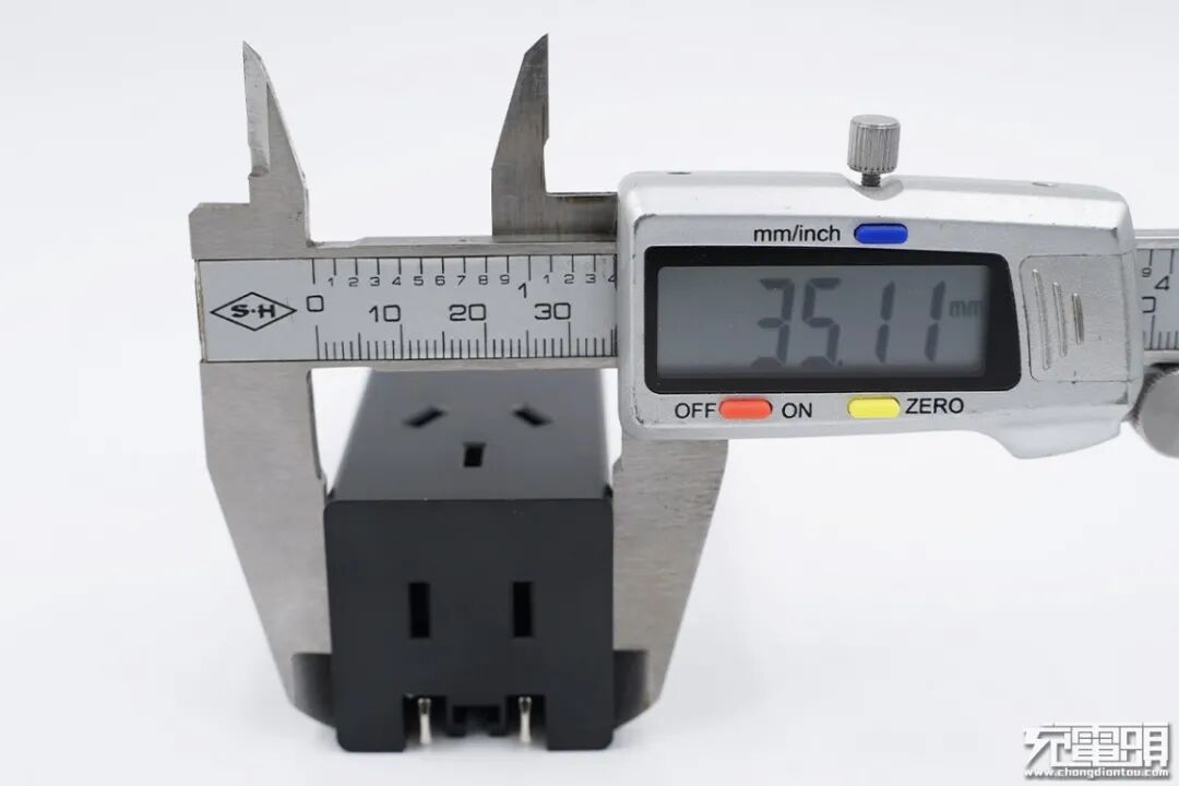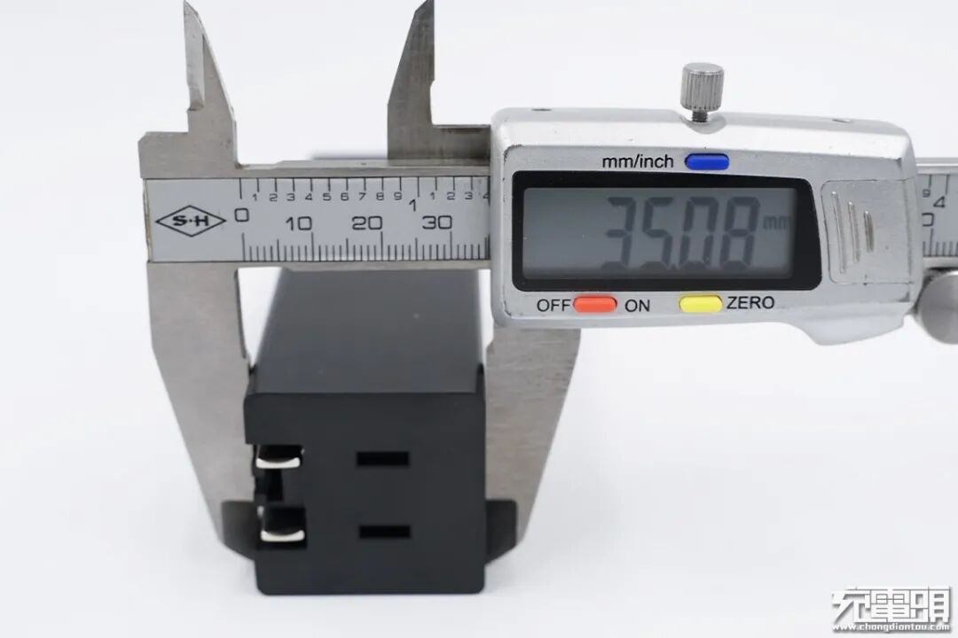 使用游标卡尺实测充电器厚度约35.08mm。