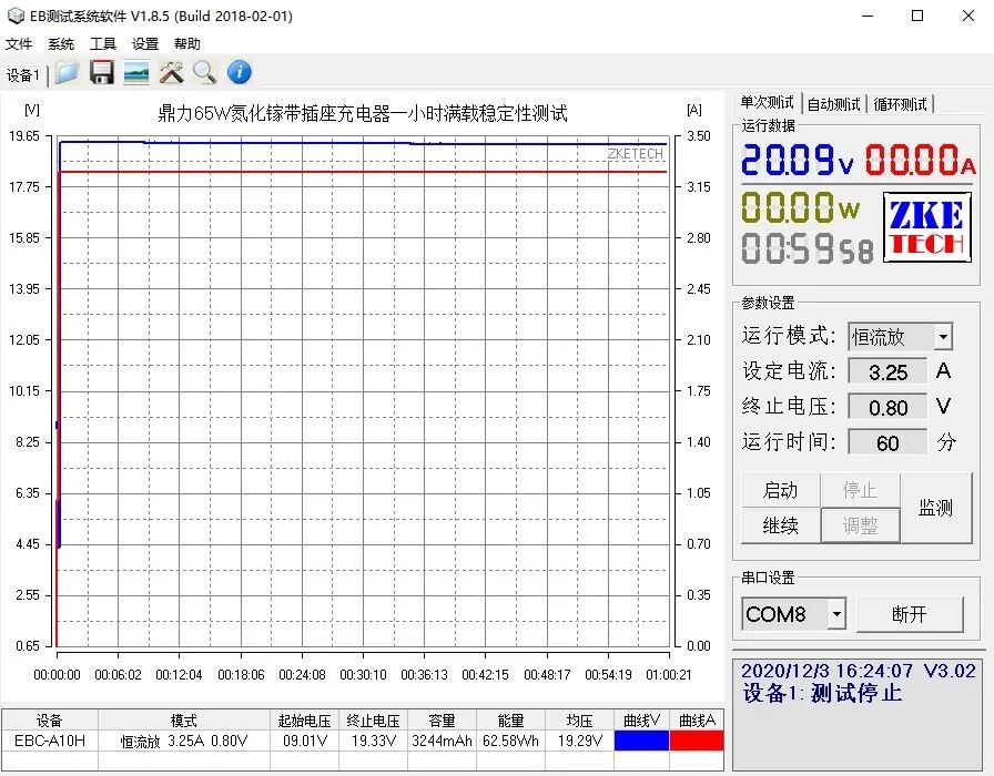 使用EB程控电子负载测试充电器的最大输出功率,以0.1A为电流步进幅度,10秒为时间间隔,最终录得最大输出为19.59V 3.4A 66.6W。