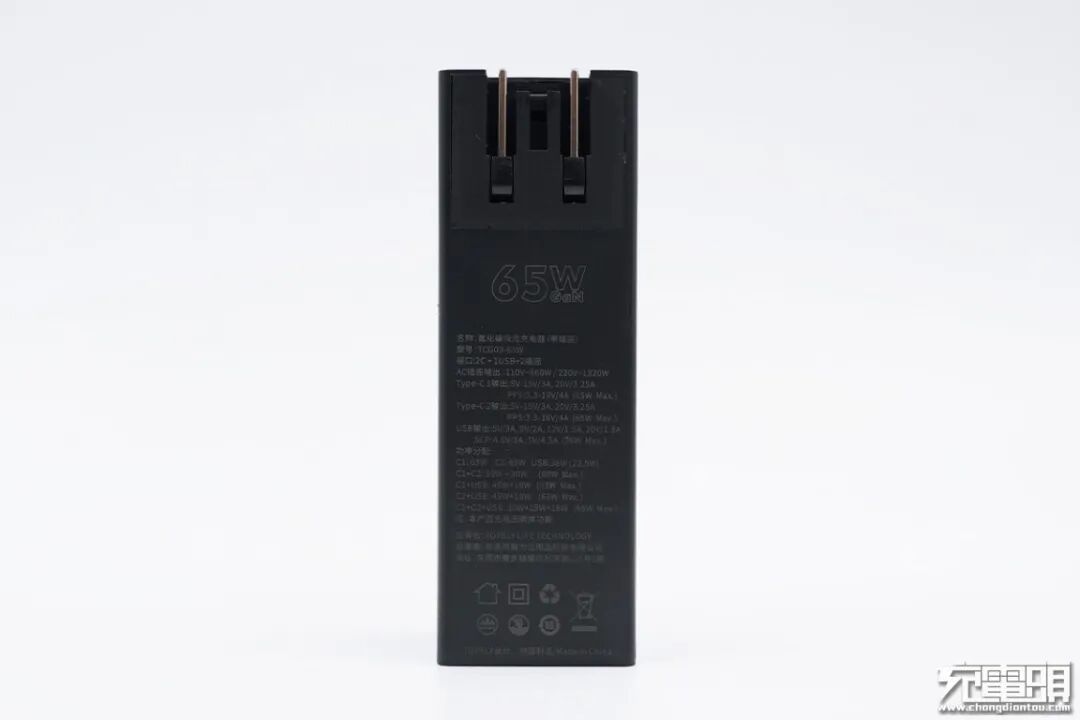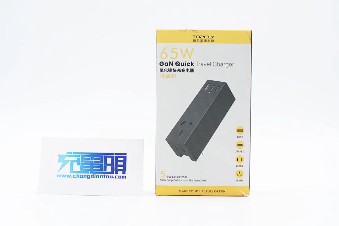 充电器的包装中规中矩,中间为产品渲染图,上下为黄色拼接,重点宣传“65W”,以及“5”个设备同时充电。