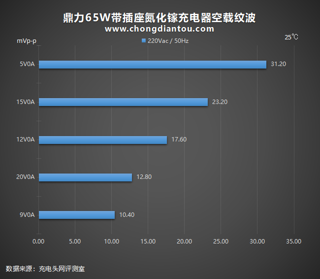 国家标准中充电器纹波要求是不高于200mVp-p,在110V 60Hz、240V 50Hz输入电压下,鼎力65W带插座氮化镓充电器所有输出功率纹波峰峰值均低于200mVp-p这个标准。