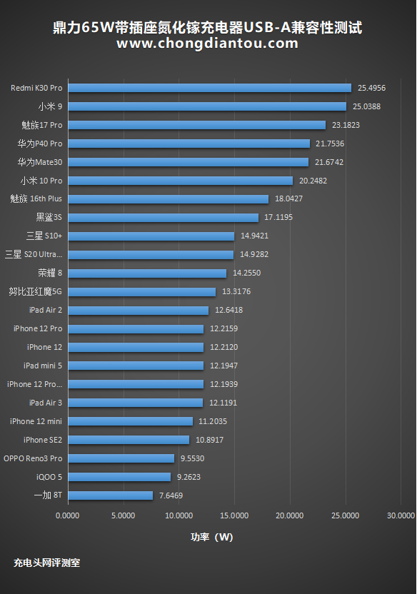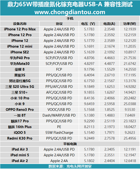 充电器USB-A充电兼容性的测试数据放在表格当中。iPhone 12 系列四台功率在12W上下徘徊;两款华为旗舰功率也接近22W左右;小米9超过25W, 小米 10 Pro超过20W,Redmi K30 Pro则超过25W;魅族 17 Pro超过23W。