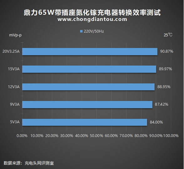 鼎力65W带插座氮化镓充电器在220V 50Hz交流输入的情况下进行了转换效率测试,测试结果如下:
