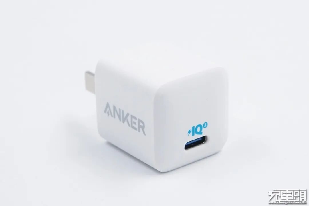 ANKER 20W充电器外观风格与前代Anker安克 Nano 18W充电器别无二样,本体使用阻燃塑料材质,四周表面磨砂,接口面板则为亮面,侧面丝印有“ANKER”LOGO,增加了品牌辨识度。充电器接口设置在靠下的位置,USB-C接口内使用蓝色胶舌。接口的上方丝印着"IQ3"字样,它是Anker安克独家的PowerIQ 3.0技术,兼容了PD、QC、Apple 2.4A等快充协议。
