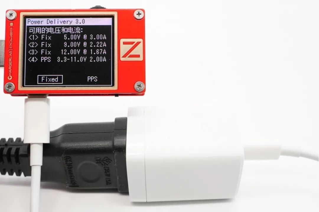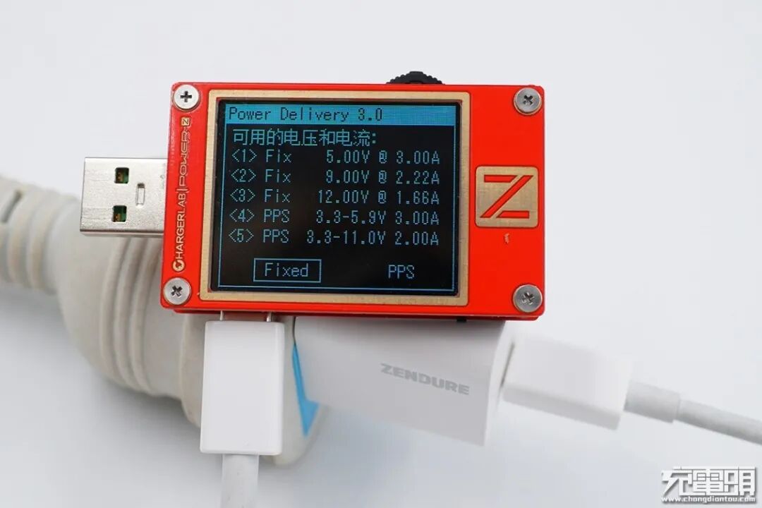 经过POWER-Z KT002 USB测试仪读取Zikko 20W PD充电器PDO报文,发现带有5V3A / 9V2.22A / 12V1.67A三个固定电压输出档,另外还带有3.3-11V2A一组PPS电压子集,可以适应更多设备使用。