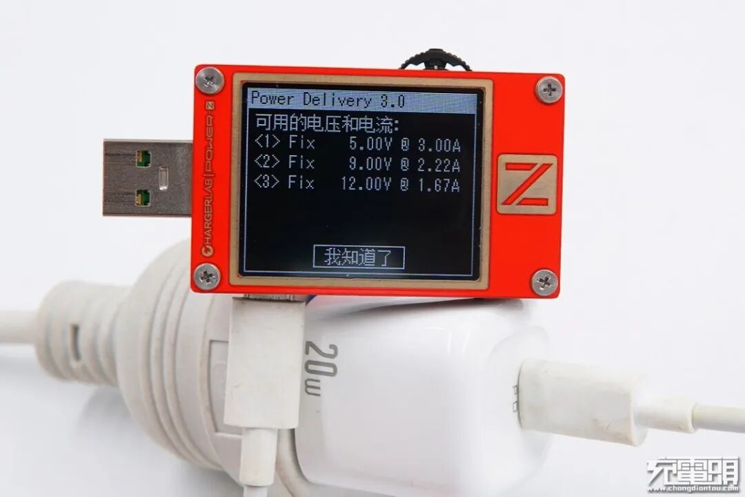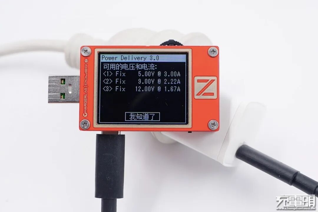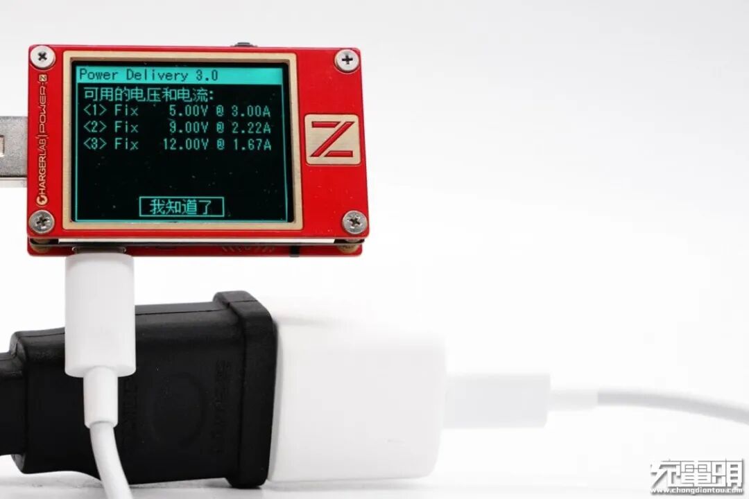 进一步检测充电的PDO报文得知,这款充电的输出支持5V3A、9V2.22A、12V1.67A三组输出电压。