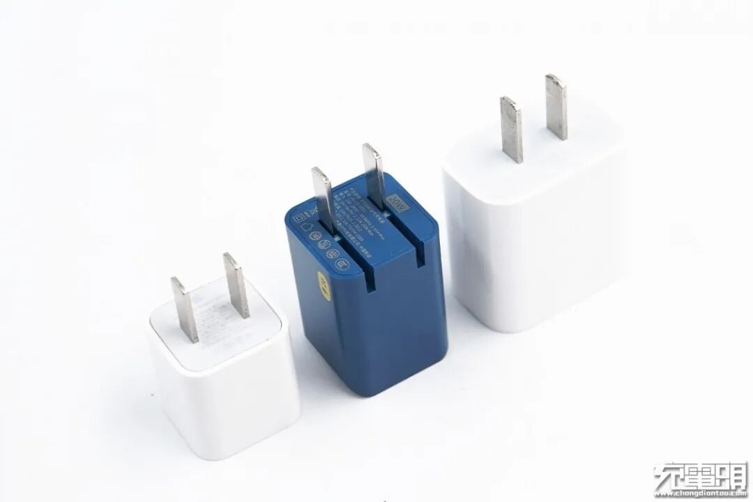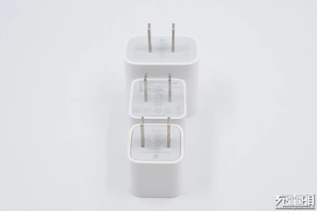 与苹果充电器作对比,从左到右分别是苹果18W PD充电器、海陆通20W PD充电器、苹果5W充电器,可见海陆通20W PD充电器支持20W快充输出体积却仅比苹果5W体积稍大。