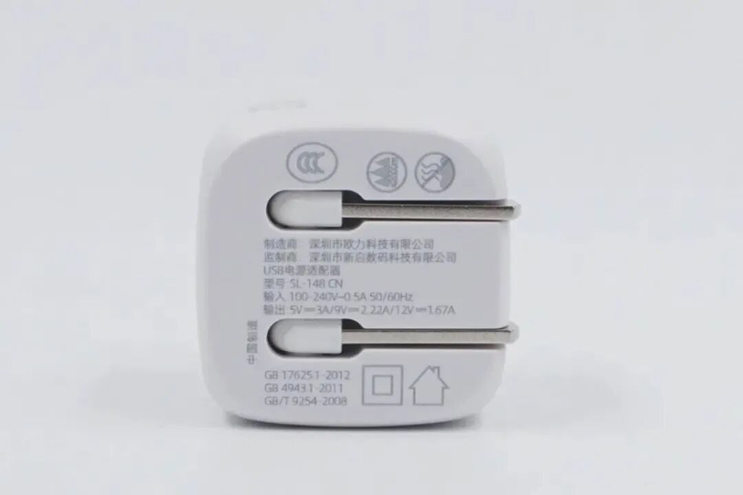外壳上标注有充电器参数信息,充电器采用可折叠插脚。型号:SL-148CN,输入参数:100-240V~0.5A 50/60HZ,输出:5V⎓3A、9V⎓2.22A、12V⎓1.67A。