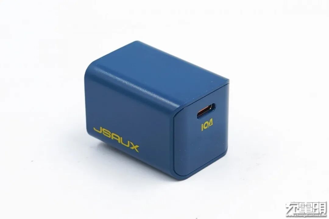 JSAUX 20W PD充电器外观独树一帜,整体以蓝色为主,偶有黄色字样点缀,优雅简洁;充电器曲线动人,令人想起手机宣传中的3D曲面手感。外壳为塑料材质,采用流行的微磨砂质感,配合流动的曲线,手感相当不俗。侧面非常克制,除了延伸出的曲面外,别无他物,侧面有黄色“JSAUX”logo,印在角落,显得比较低调。